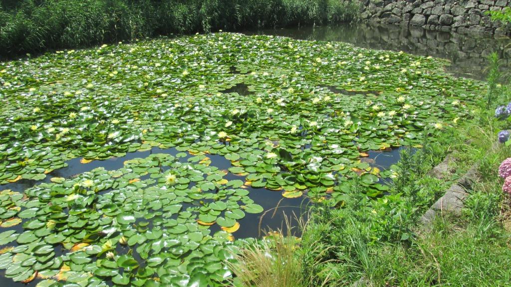 今年も満開で、横の堀には黄色いハスの花もきれいに咲いていました。